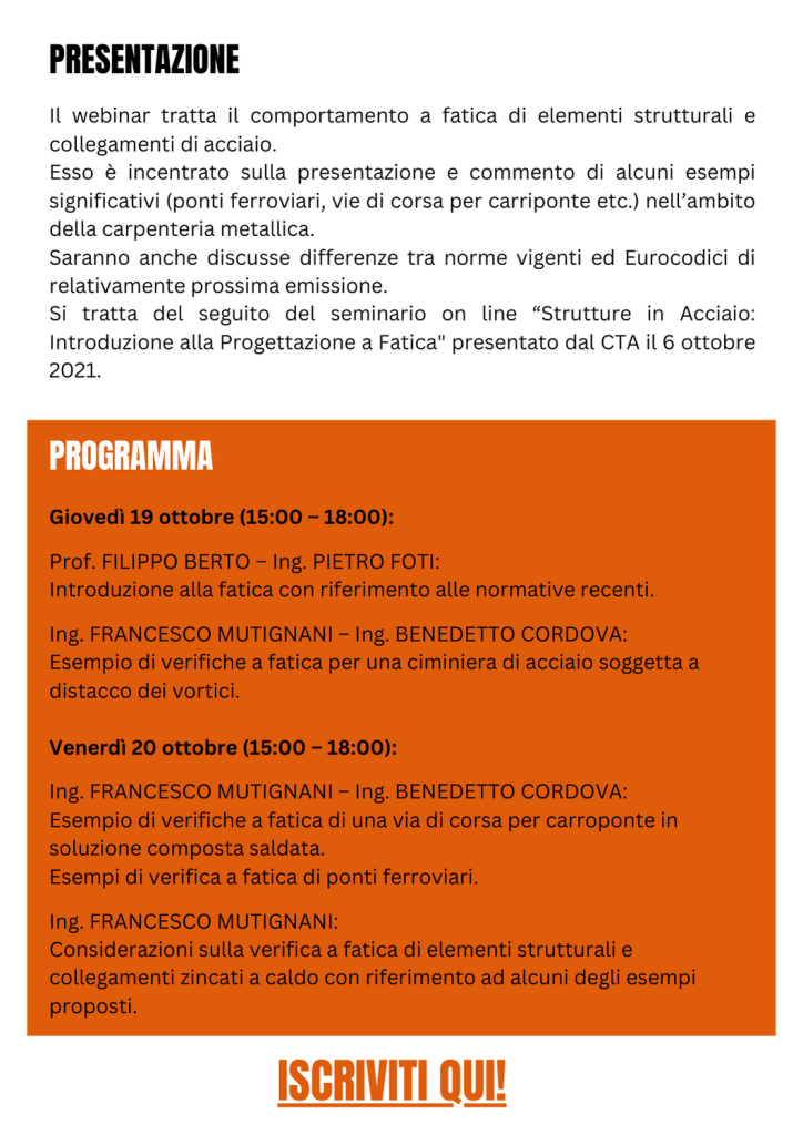 19 E 20 OTTOBRE 2023 – FATICA NELLE STRUTTURE IN ACCIAIO: NORMATIVA VIGENTE ED ESEMPI DI PROGETTAZIONE.