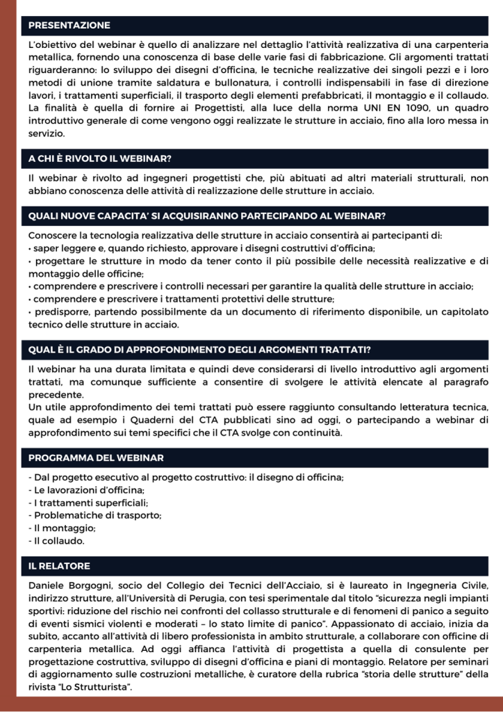 3 NOVEMBRE 2023 – LA PRATICA DELLE STRUTTURE IN ACCIAIO: DISEGNO D’OFFICINA, LAVORAZIONI, TRATTAMENTI SUPERFICIALI, TRASPORTO, MONTAGGIO, COLLAUDO.