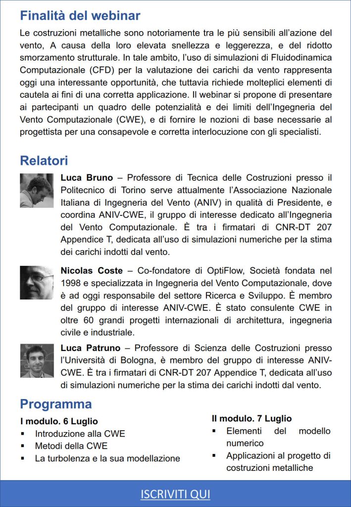 6 E 7 LUGLIO 2023: WEBINAR L’INGEGNERIA DEL VENTO COMPUTAZIONALE PER IL PROGETTO DI COSTRUZIONI METALLICHE: ISTRUZIONI PER L’USO ED EFFETTI COLLATERALI