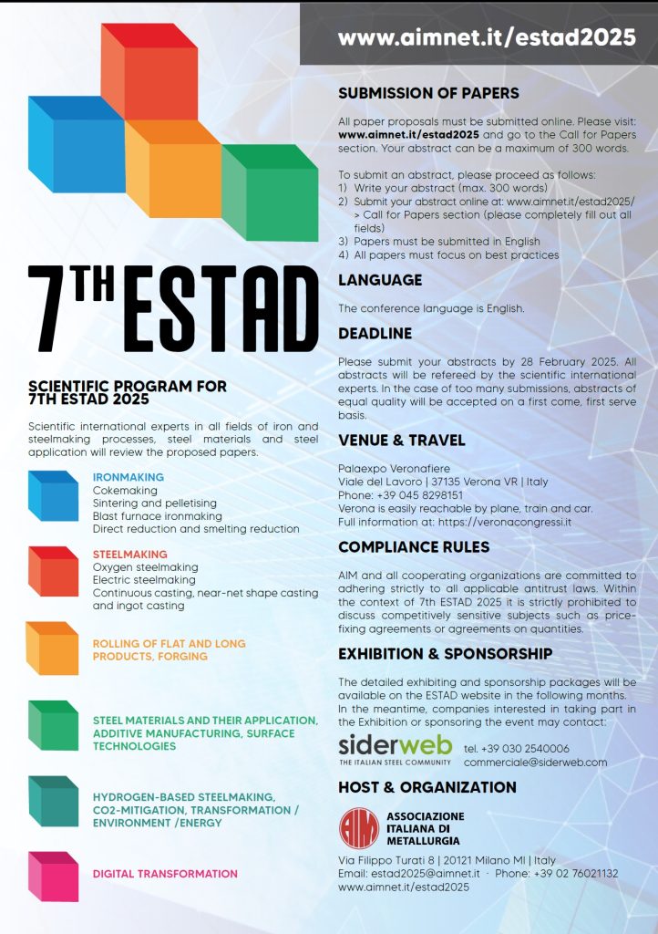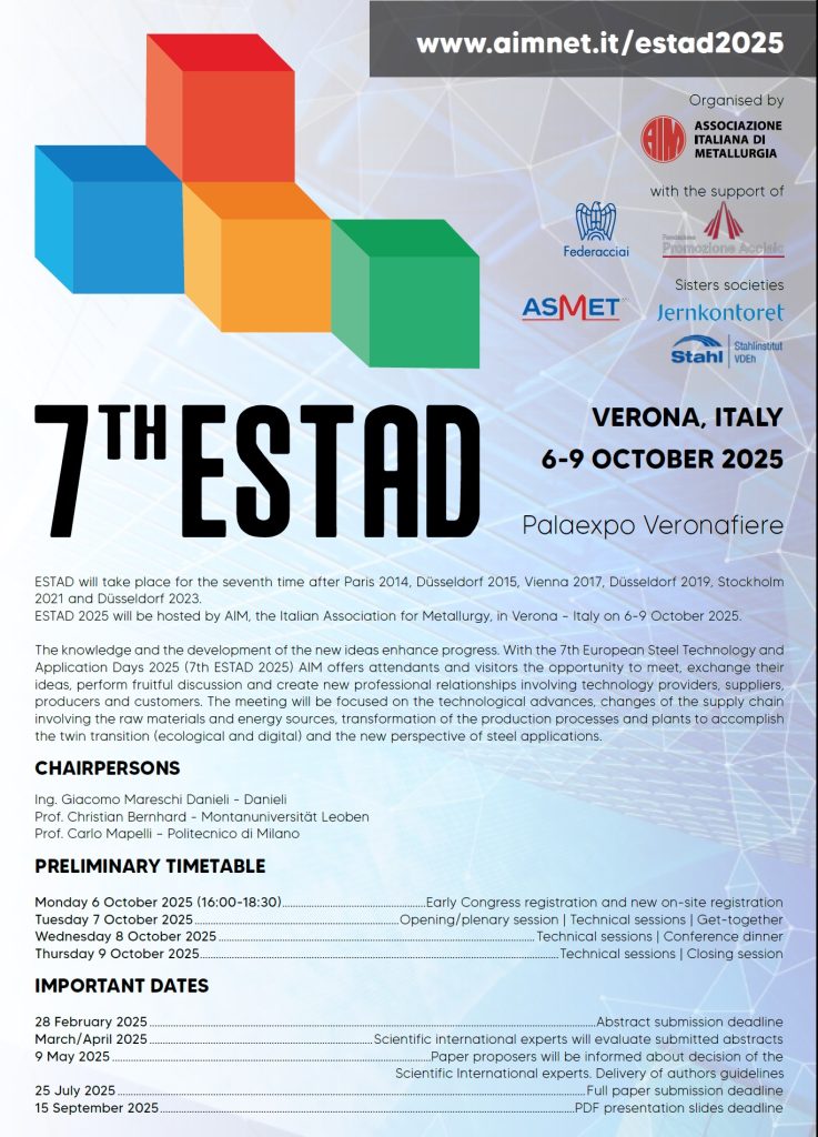 7th ESTAD 2025 – 7th European Steel Technology and Application Days 2025 – Verona – Palaexpo Verona Fiere – 6-9 Ottobre 2025