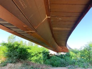 Il secondo ponte sul fiume Tevere, con relativi raccordi stradali di collegamento fra la zona industriale Alto Tevere evia Bartolomeo della Gatta sul tracciato della via comunale dei Banchetti, è un asse stradale moderno con un elevato livello di servizio capace di soddisfare un ampio ventaglio di tipi di traffico (sia ciclabile-pedonale sia locale leggero sia industriale). Il processo progettuale è stato completo, dalla fase di progetto preliminare alla fase di progetto definitivo fino alla fase di progetto esecutivo concludendosi con la Direzione Lavori. La soluzione proposta, sia per le sottostrutture che per l’impalcato, ha permesso di relizzare un ponte con un impatto minimo sul territorio e in particolare sull’alveo fluviale in termini di strutture temporanee e tempi di esecuzione. Il nuovo ponte è una travata continua in acciaio-calcestruzzo che supera il Tevere con tre luci di 43 m + 58 m + 43 m ed una lunghezza totale di 144 m. La sezione stradale è un tipo F2 affiancato da un percorso ciclo-pedonale per una larghezza totale di 13,2 m. L’impalcato è sorretto da due travi in acciaio autopatinabile, con le anime inclinate di 38°, collegate da diaframmi reticolari mentre sulle spalle i diaframmi sono ad anima piena e permettono di aumentare la distanza tra gli appoggi, in presenza di una curvatura accentuata dell’asse stradale. Le travi hanno una altezza variabile tra 1,60 m (sulle spalle e nella mezzeria della campata centrale) e 2,8 m (sulle pile). Una controventatura reticolare inferiore configura il comportamento a cassone secondo Bredt; questa scelta, piuttosto rara in questo ambito di luci, nasce dalla presenza di un singolo appoggio sulle pile. Le pile hanno una sezione circolare molto ridotta di 2,4 m di diametro. Sono state definite, infatti, all’uopo di ridurre l’impronta a terra e minimizzare il loro impatto sulla corrente durante le piene severe del fiume.