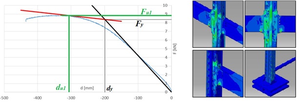 Figura 3. Curva di capacità e dettagli modello con elementi finiti.