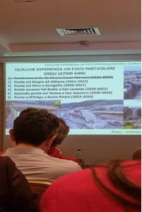 Dopo una breve introduzione sulla missione del CTA, il primo intervento della giornata, presentato dall’Ing. Paolo Manella, tecnico dell’ANAS, ha riguardato le soluzioni adottate per l’intervento di manutenzione straordinaria del ponte Leonardo Da Vinci a Sasso Marconi (progetto del Prof. Bruno Bottau), ritenutasi necessaria a seguito della forte condizione di degrado in cui versava, causata dalla mai avvenuta manutenzione sin dalla data di ultimazione dei lavori nel 1957 e che imposto la chiusura alla circolazione nel 2021. L’obiettivo dell’intervento era salvaguardare la struttura ad arco preesistente in cemento armato, eseguendo solo ripristini corticali e sostituendo l’impalcato con uno nuovo in acciaio-calcestruzzo, mantenendo sostanzialmente invariati i carichi sulla struttura portante.