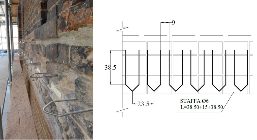 un’altezza di 62,50 m circa: lo spessore delle murature, costante lungo tutto il fusto quattrocentesco (che ne riveste circa i primi 40 m in elevazione), è poco più che 2,00 m. In data 24 ottobre 2017 si manifestava l’improvvisa caduta di mattoni e calcinacci provenienti dalla facciata SUD/SUD-OVEST del campanile: le dimensioni dei maggiori pezzi caduti erano dell’ordine di grandezza di circa mezzo mattone e non si rilevavano fortunatamente danni a persone. La zona di distacco si localizzava a quota 23 m. Di fronte a questi fenomeni di distacco e alla presenza di potenziali zone di distacco e di deterioramento, sono stati effettuati dei lavori di restauro e di consolidamento leggero su diverse parti della torre campanaria al fine di assicurare sia l’integrità della struttura che la sicurezza della zona circostante. I lavori di consolidamento effettuati sulla torre campanaria del duomo di Torino hanno riguardato le cornici decorative presenti a quota 14 e 23 m, la zona circostante l’antica cella campanaria a quota 33 m e la copertura. A quota 14 m è avvenuto il lavoro di consolidamento maggiore di tutto l’apparato delle cornici: si è operato attraverso un intervento di microchirurgia con l’inserimento di microperni in acciaio a “C” nei giunti di malta creando così una ristilatura di questi localizzata e dando un supporto, con schema statico “a mensola”, ai blocchi di mattoni. Si sono inoltre fissate, sempre attraverso l’uso di microperni di acciaio, le formelle decorative attraverso un’appensione di queste al supporto murario. Tutto il lavoro di consolidamento è stato avallato a monte mediante una modellazione di dettaglio ad elementi finiti (mediante elementi finiti tridimensionali tipo “brick”) delle cornici oggetto di consolidamento: si è così valutato l’effetto benefico dell’introduzione dei microperni sul comportamento statico delle cornici.