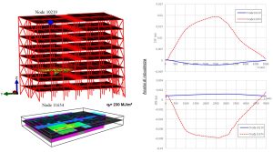 Lo schema statico dell’edificio è costituito da telai in acciaio formati da colonne incastrate alla base e collegate ai piani intermedi da bielle costituite dalle travi di impalcato, con solai costituiti da lastre in cemento armato prefabbricato con intradosso a faccia vista, legate alle travi in acciaio per collaborare con le stesse nel resistere alle sollecitazioni orizzontali. Si tratta di una struttura pendolare in cui ai pilastri è affidata la trasmissione alla base dei soli carichi verticali. Le azioni orizzontali vengono riportate, in fase di montaggio della struttura, alle travi dei vani scale-ascensori in c.a. e alle pareti controventate di testata, mediante controventature orizzontali di piano opportunatamente disposte. Ai materiali, trattandosi di edifici esistenti, è stato applicato un opportuno livello di conoscenza ai sensi del § 8.5.4 delle NTC 2018, [3]. Si considera per il caso in esame il livello 2 (conoscenza limitata) al quale è associato un fattore di confidenza FC pari a 1,2, utilizzato per determinare le caratteristiche meccaniche dei materiali esistenti, avendo proceduto ad una campagna prove limitata in situ. […]
