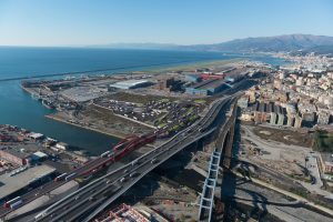 La soluzione sviluppata prevede un impalcato continuo su tre campate, realizzato con travi di tipo scatolare di altezza variabile da 1700 a 2000 mm. La campata centrale, di luce pari a 98,00 m, consente lo scavalco del torrente Polcevera ed è realizzata da una struttura ad arco a spinta eliminata. Essa sostiene, mediante un doppio ordine di pendini, realizzati con barre a sezione circolare piena, le due vie di corsa. Le travi delle campate laterali della via intermedia sono state concepite come naturale prosecuzione della trave-tirante intermedia in modo da conferire al prospetto una continuità formale e sono sostenute da dei puntoni inclinati che trovano origine dalla base degli archi (figura 2). Le due travi principali sono tra loro collegate da traversi tipici realizzati con una sezione metallica aperta a doppio T di altezza pari a 1280 mm e interasse tipico di circa 6,00 m. I traversi tipici della via inferiore invece hanno altezza ridotta pari a 780 mm ma interasse dimezzato a 3,00 m al fine di garantire il franco minimo richiesto per il passaggio del traffico veicolare. […]