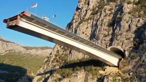 Il nuovo ponte sul fiume Cetina fa parte del progetto della viabilità di variante della trafficata strada nazionale D8 in corrispondenza della città turistica di Omis (in italiano Almissa), sulla riviera dalmata poco a sud di Spalato. La città è posta sulla foce del fiume, il quale, poco prima, scorre compreso fra due alte pareti rocciose generando una suggestiva gola. Il nuovo tracciato stradale corre in galleria prima e dopo la gola, a circa 70 m di altezza sul livello del mare; il ponte sovrappassa il fiume in quota, in un punto in cui le due pareti rocciose distano circa 140 m, con un impalcato in acciaio a cassone monocellulare a lastra ortotropa a tre campate lungo complessivamente 216 m. Le due campate laterali, lunghe ciascuna 30 m, sono interamente entro le gallerie, e sono opportunamente“zavorrate” per fungere da efficace vincolo di continuità alla campata centrale di luce pari a 152 m, che è caratterizzata da una sezione ad altezza variabile da 6,50 m agli appoggi a 2,50 m in mezzeria. L’articolo descrive le modalità di montaggio e varo adottate, rese naturalmente particolarmente complesse dalla forte luce centrale priva di possibilità di appoggi intermedi provvisori, e dalla angustia degli spazi per l’assemblaggio, interamente all’interno delle gallerie.