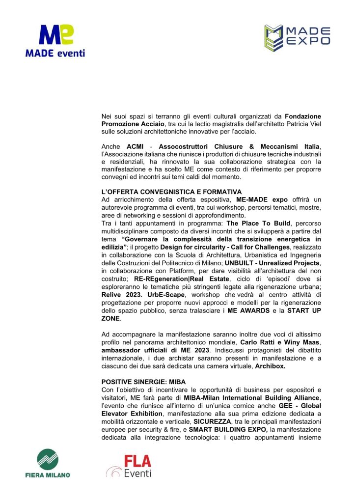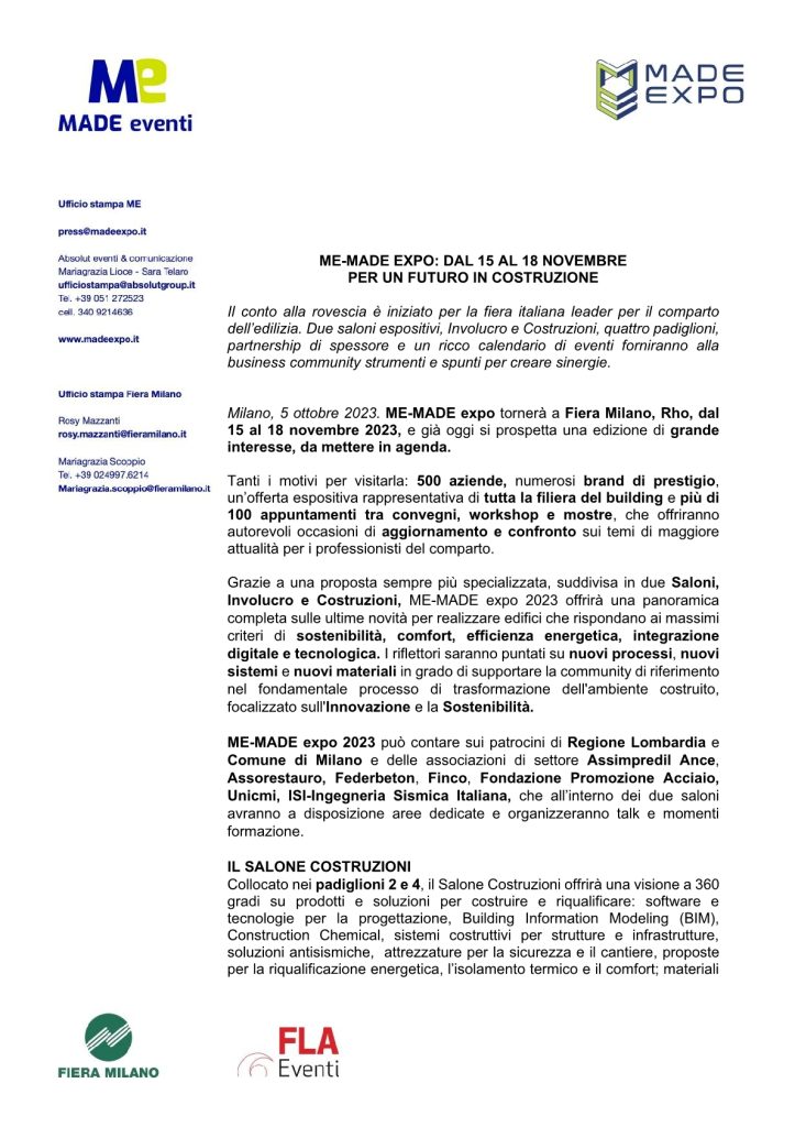 ME-MADE EXPO: DAL 15 AL 18 NOVEMBRE PER UN FUTURO IN COSTRUZIONE