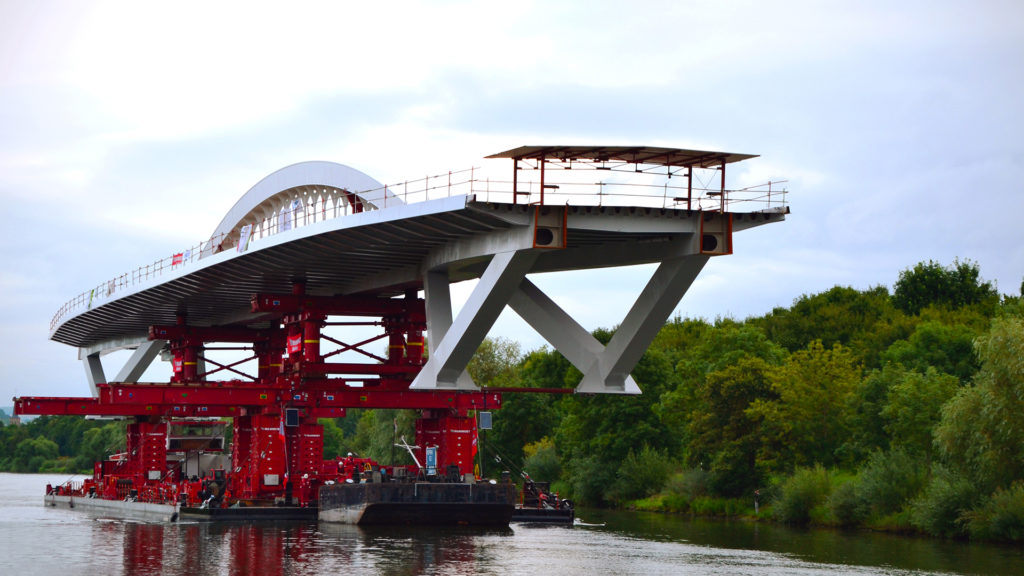 1955. Era un’opera funzionale che era stata realizzata sotto vincoli di budget e tempo lasciando da parte l’estetica. L’amministrazione dei “Ponts et Chaussées” aveva osservato, durante una campagna di controllo dei cavi post-compressi della struttura esistente, che le iniezioni di malta cementizia erano in gran parte carenti e quindi che la protezione dalla corrosione non era più garantita. In effetti molti cavi non erano più tesi, probabilmente a causa della corrosione. Dal 2002, la manutenzione preventiva e una riduzione del traffico avevano permesso di mantenere temporaneamente il ponte in servizio fino alla sua sostituzione definitiva. La struttura scelta per la nuova struttura è quella di un ponte a 4 campate, di cui la campata principale che attraversa la Mosella è ad arco.La scelta di utilizzare l’acciaio è dovuta alla necessità di ridurre al minimo la durata dei lavori è all’imposizione di allargare la via fluviale navigabile. In effetti, prevedendo una futura riqualificazione della chiusa di Grevenmacher come parte del progetto “Grand Canal Rhône Moselle” (Grande Canale Rodano-Mosella) tra Mulhouse e la Saôna, era necessario rimuovere la pila centrale che avrebbe ostacolato la futura navigazione delle imbarcazioni in approccio o in uscita dalla chiusa. Inoltre bisognava garantire un’altezza libera di navigazione di 7,50 m rispetto al livello 133,47 m s.l.m. (livello più alto delle acque navigabile). La chiusura al traffico della strada è durata soltanto quattro mesi e mezzo. La chiusura della via navigabile è durata soltanto una settimana.[…]