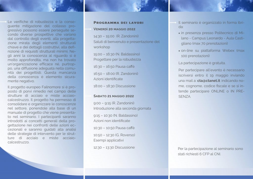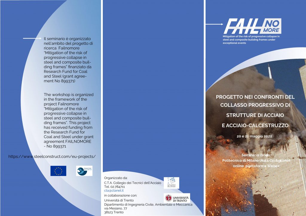 SEMINARIO: PROGETTO NEI CONFRONTI DEL COLLASSO PROGRESSIVO DI STRUTTURE DI ACCIAIO E ACCIAIO-CALCESTRUZZO (20 e 21 maggio 2022)