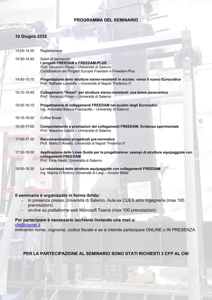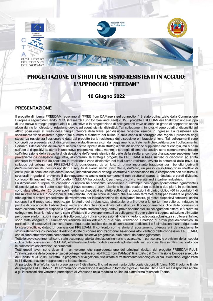 SEMINARIO: PROGETTAZIONE DI STRUTTURE SISMO-RESISTENTI IN ACCIAIO: L’APPROCCIO “FREEDAM” (10 Giugno 2022)