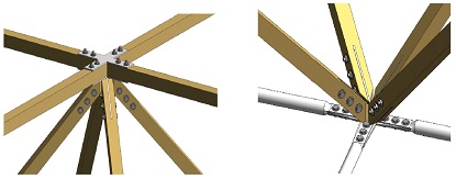 In questo articolo viene presentato un innovativo sistema spaziale reticolare composito in acciaio e bambù laminato (glubam). Nello specifico, la struttura reticolare oggetto di studio è costituita da elementi cavi in acciaio al corrente inferiore, mentre il corrente superiore e le barre diagonali sono realizzati in glubam. Vengono dapprima illustrate le principali proprietà fisico-meccaniche del glubam e dell’acciaio impiegati nel prototipo di struttura realizzato. Successivamente si passa ad analizzarne il comportamento sotto l’azione di forzanti statiche e dinamiche. In particolare, il comportamento statico è stato esaminato applicando dei carichi uniformemente distribuiti sulla struttura allo scopo di valutarne la capacità ed i meccanismi di danneggiamento. La risposta dinamica in presenza di eccitazione ambientale e nel caso di vibrazioni libere è stata invece studiata al fine di identificare frequenze, modi di vibrare e coefficienti di smorzamento della struttura. Un archetipo di questa speciale struttura reticolare è stato inoltre progettato per realizzare la copertura d’ingresso di un edificio universitario in Cina. I risultati sperimentali di questo studio sono destinati a fornire orientamenti pratici per l’analisi e la progettazione di sistemi ibridi acciaio-glubam sotto carichi statici e dinamici.