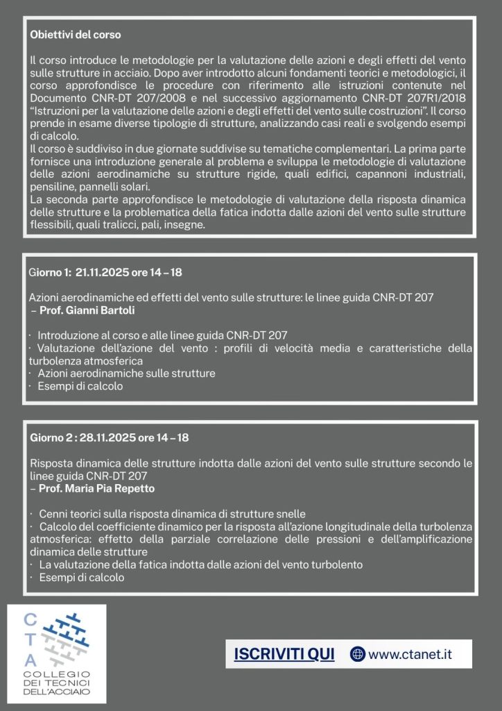 WEBINAR: Azioni ed effetti del vento sulle strutture in acciaio – linee guida CNR-DT 207 ed applicazione pratica: 21 e 28 novembre 2025